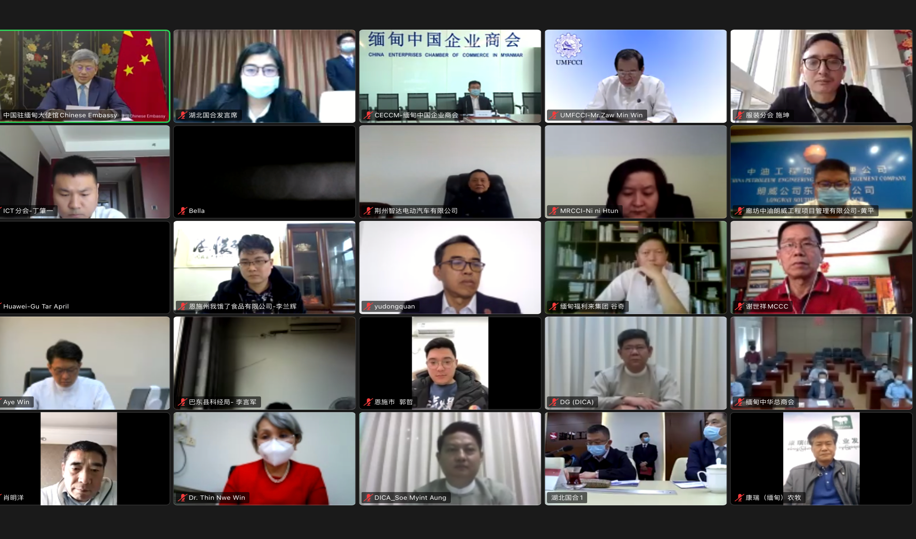 1月26日,由中国驻缅甸大使馆和湖北省商务厅共同主办,缅甸中国企业商会、缅甸工商联、湖北工建集团承办的中国湖北—缅甸投资合作对接会在线举行。驻缅大使陈海、经商参赞谭书富,湖北省商务厅副厅长陈华荣,缅甸投资与公司管理局局长丹欣伦、缅甸工商联主席佐敏温出席会议,中缅政府相关部门主管官员、中缅企业家代表300余人在中、缅、吉尔吉斯斯坦等地会场在线与会。