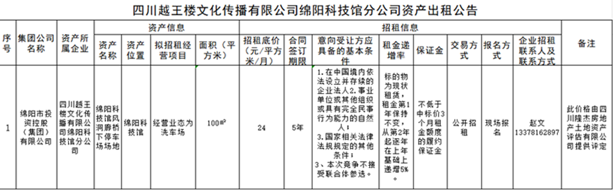 四川越王楼文化传播有限公司绵阳科技馆分公司资产出租