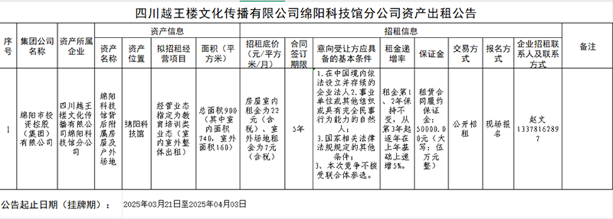 四川越王楼文化传播有限公司绵阳科技馆分公司资产出租公告