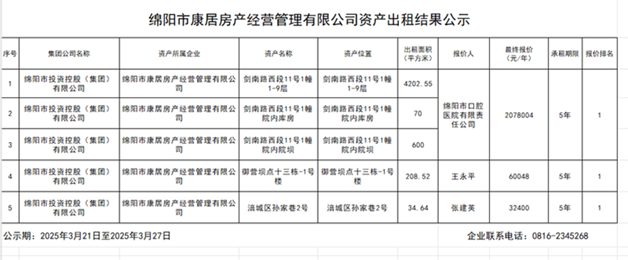 绵阳市康居房产经营管理有限公司资产出租结果公示