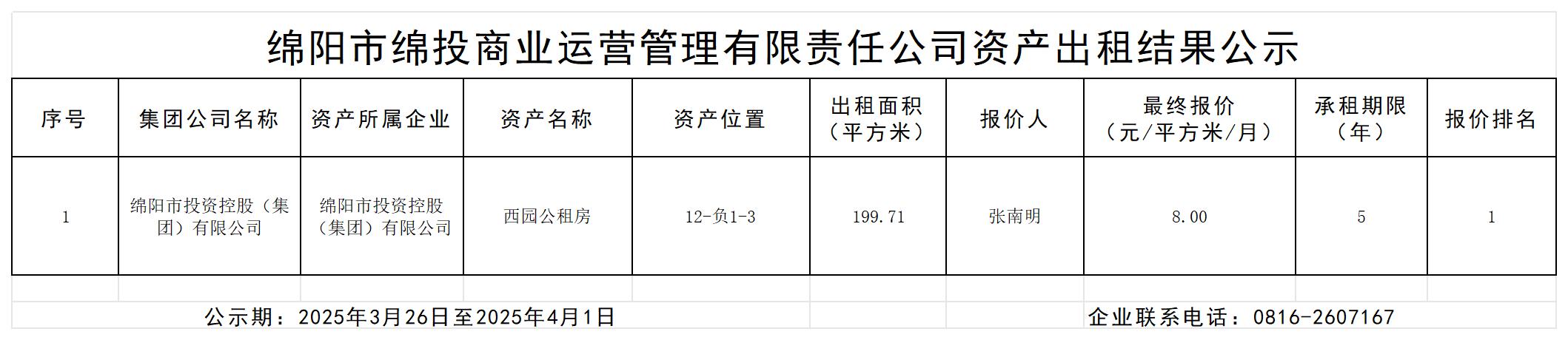 绵阳市k1体育注册就送38元商业运营管理有限责任公司资产出租结果的公示