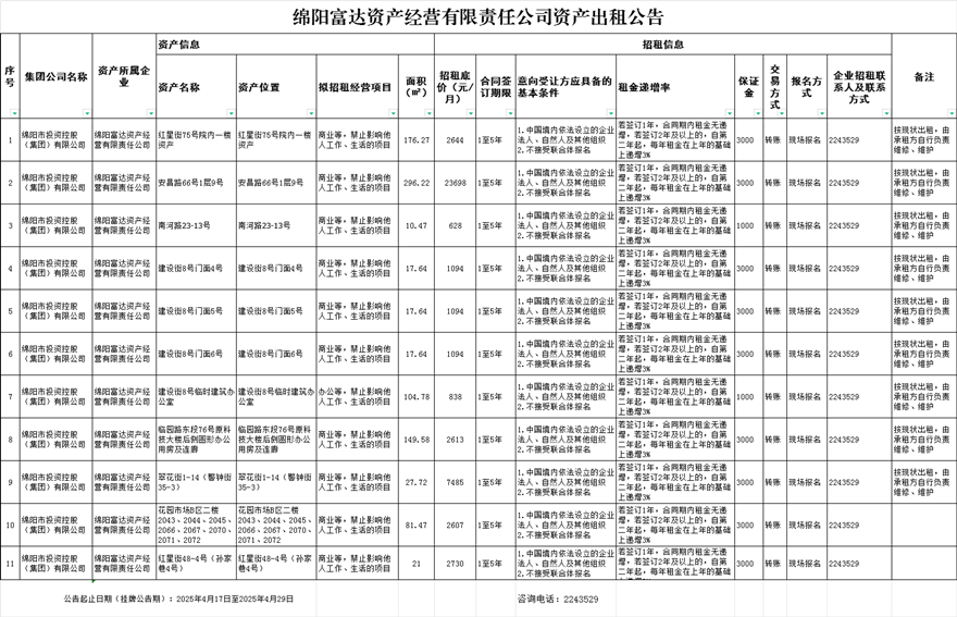 绵阳富达资产经营有限责任公司资产出租公告