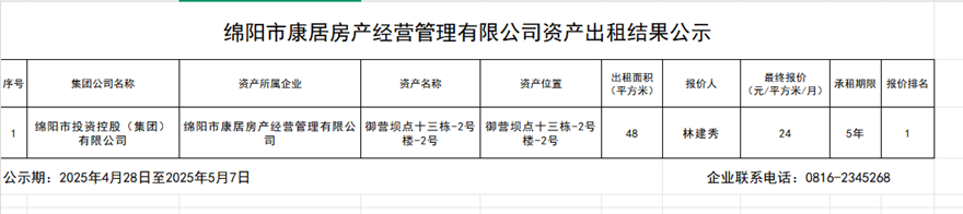 绵阳市康居房产经营管理有限公司资产出租结果公示