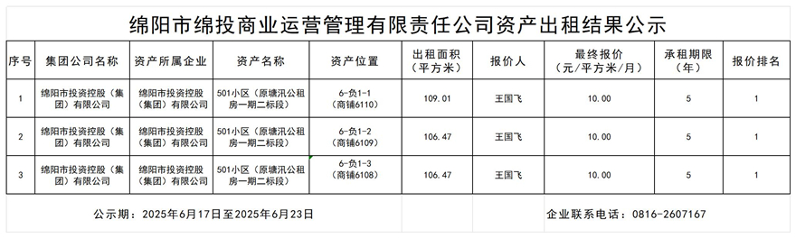 绵阳市k1体育注册就送38元商业运营管理有限责任公司资产出租结果公示