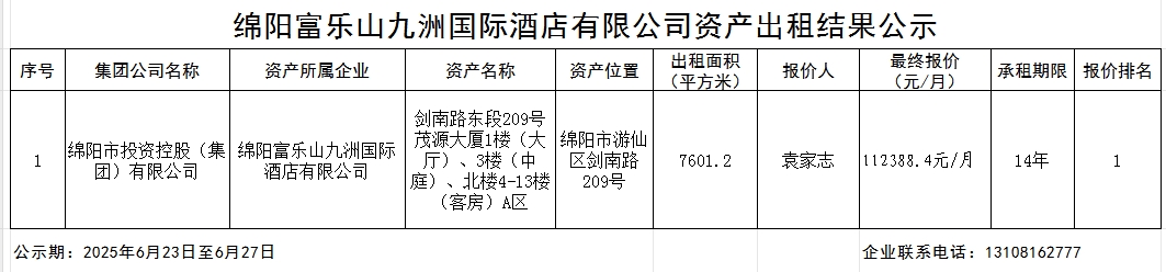 绵阳富乐山九洲国际酒店有限公司资产出租结果公示