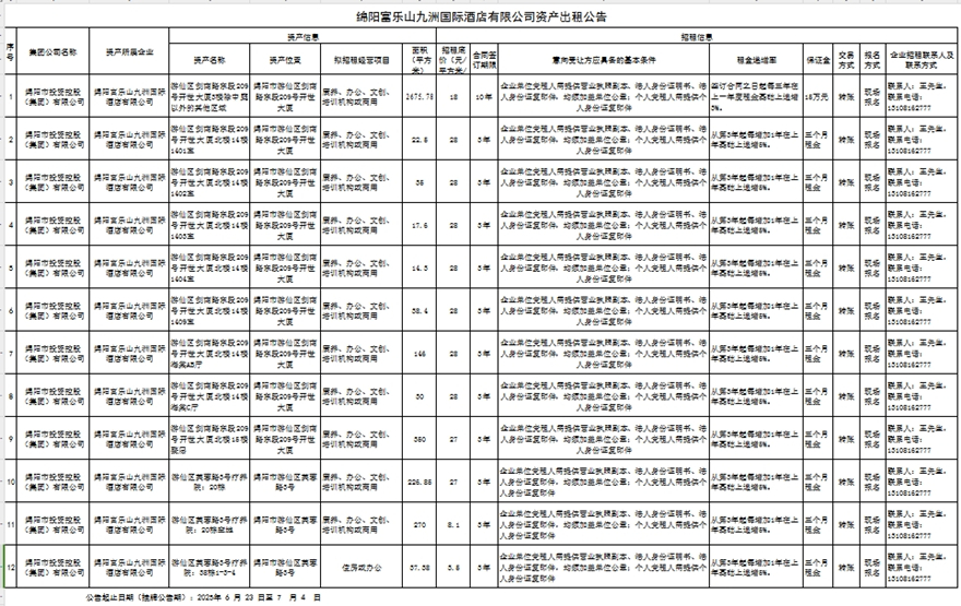 绵阳富乐山九洲国际酒店有限公司资产出租公告