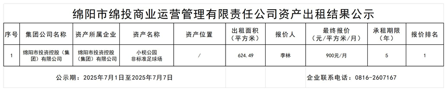 绵阳市k1体育注册就送38元商业运营管理有限责任公司资产出租结果公示