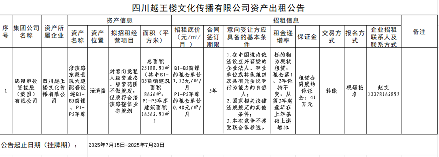 四川越王楼文化传播有限公司资产出租公告