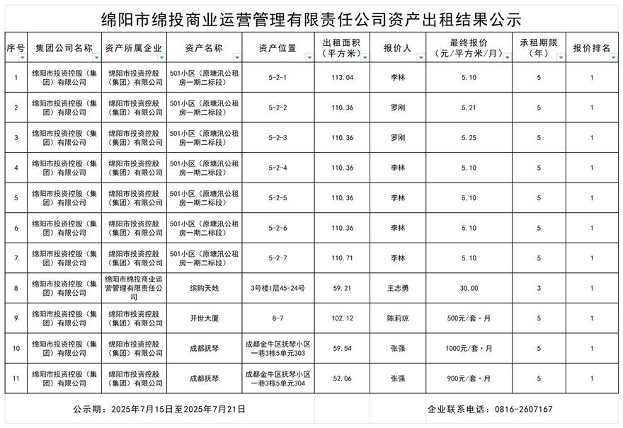 绵阳市k1体育注册就送38元商业运营管理有限责任公司资产出租结果公示