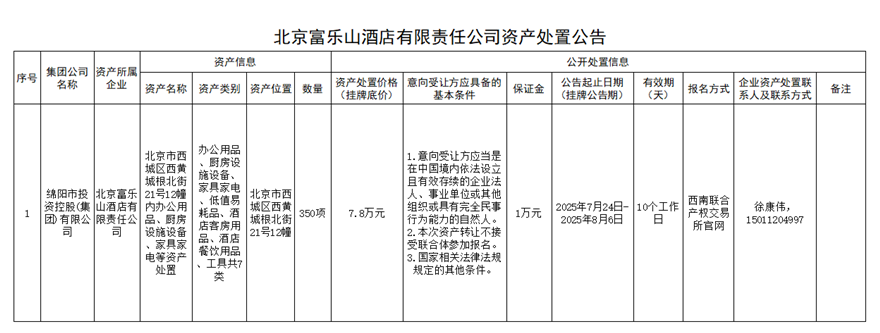 北京富乐山酒店有限责任公司资产处置公告