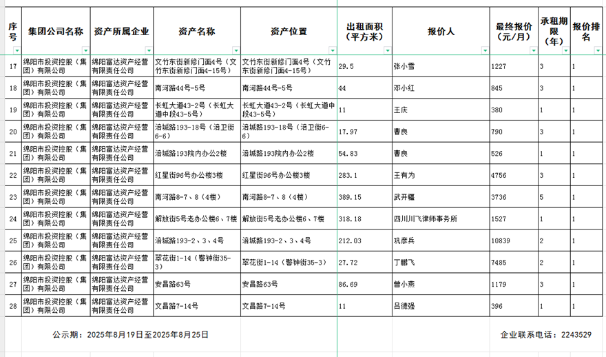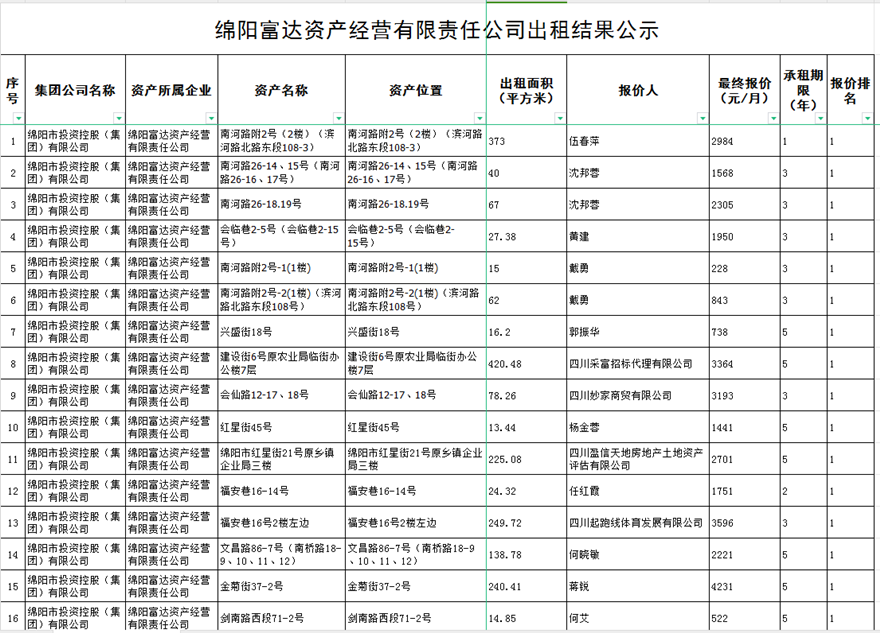 绵阳富达资产经营有限责任公司出租结果公示