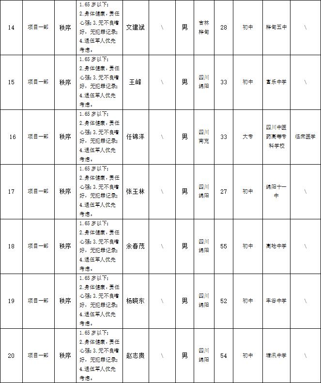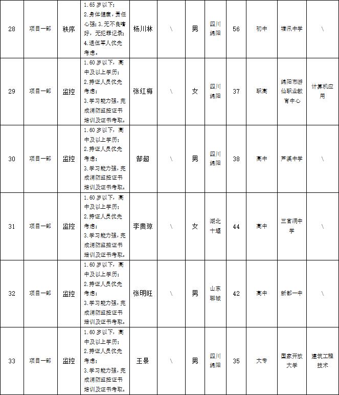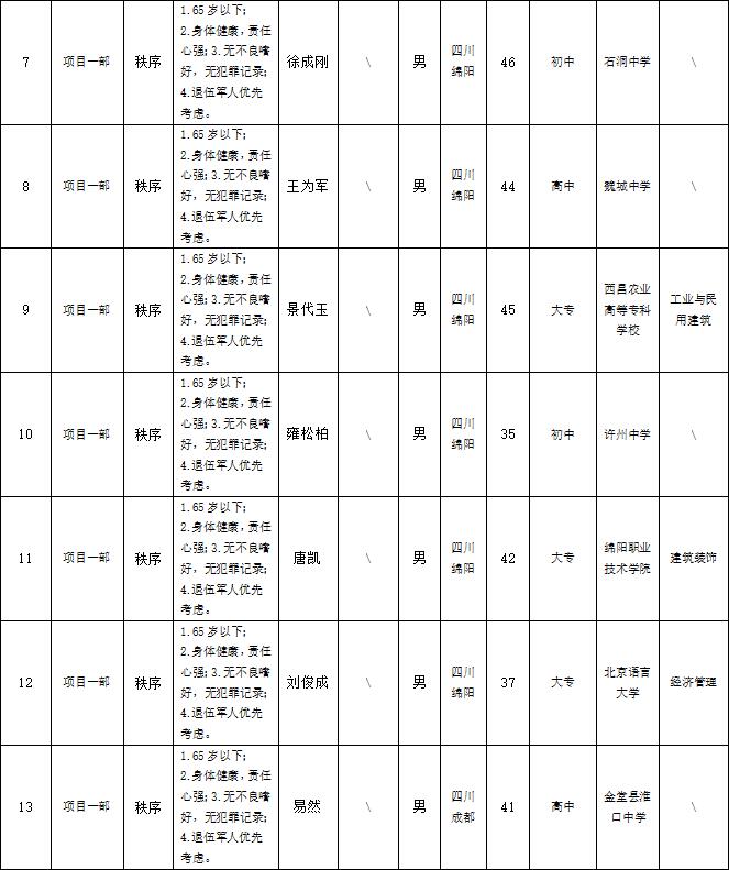 根据绵阳市康来物业服务有限公司发布的招聘公告及招聘相关规定,经面试等程序,拟录用以下人员到各项目部工作,现予以公示,具体情况如下: