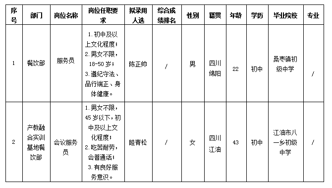 根据绵阳市绵州嘉来会务服务有限公司发布的招聘公告及招聘相关规定,经面试、体检等程序,拟录用陈正帅、眭青松同志到餐饮部、产教融合实训基地餐饮部工作,现予以公示,具体情况如下: