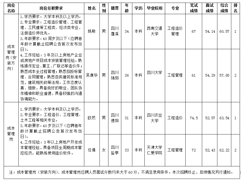 根据绵阳市k1体育注册就送38元置地有限公司发布的招聘公告及招聘相关规定,经笔试、面试等程序,现将笔试、面试成绩予以公示。