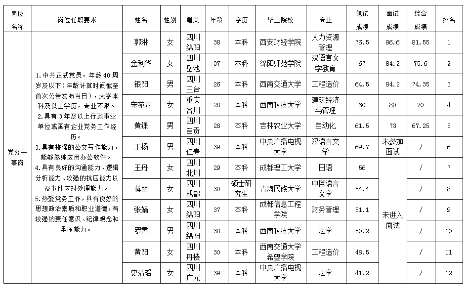 根据绵阳市投资控股(集团)有限公司发布的招聘公告及招聘相关规定,经笔试、面试等程序,现将笔试(面试)成绩予以公示。