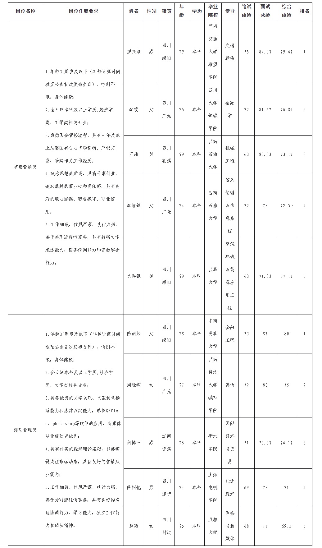 根据绵阳市k1体育注册就送38元商业运营管理有限责任公司发布的招聘公告及招聘相关规定,经笔试、面试等程序,现将笔试、面试成绩予以公示。