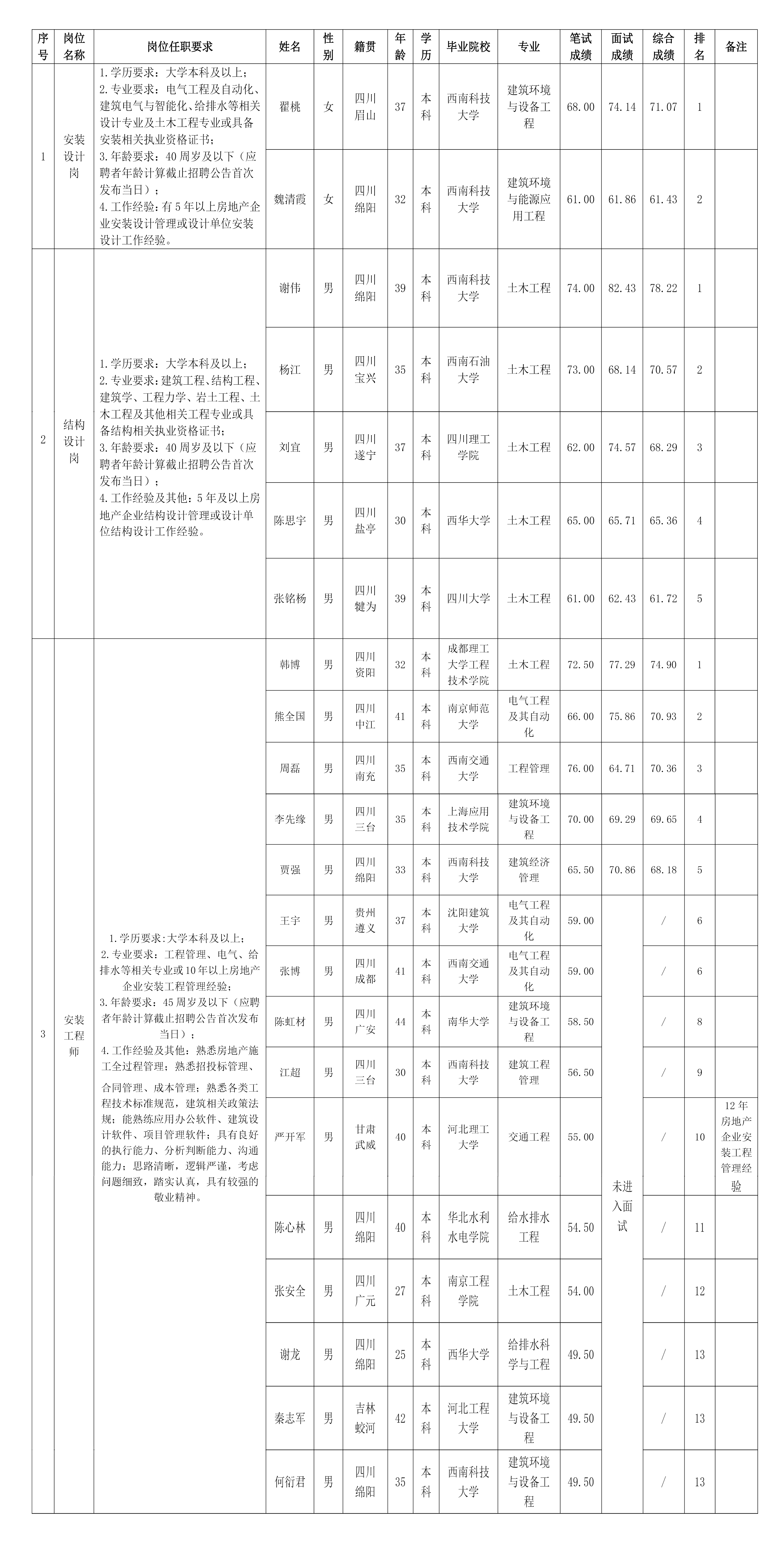 【公开招聘】绵阳市k1体育注册就送38元置地有限公司关于安装设计岗等岗位测试成绩的公示