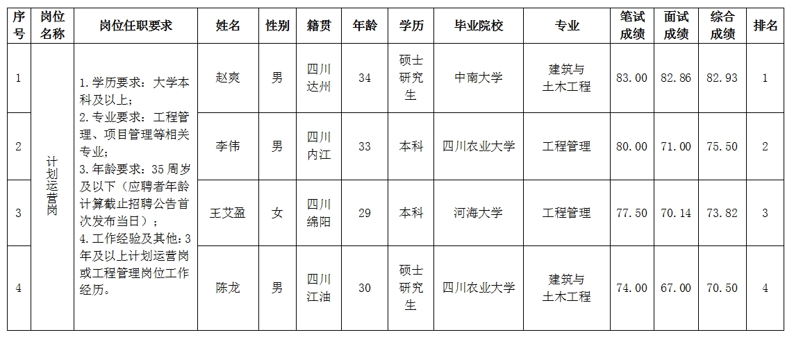 根据绵阳市k1体育注册就送38元置地有限公司发布的招聘公告及招聘相关规定,经笔试、面试等程序,现将笔试、面试成绩予以公示。