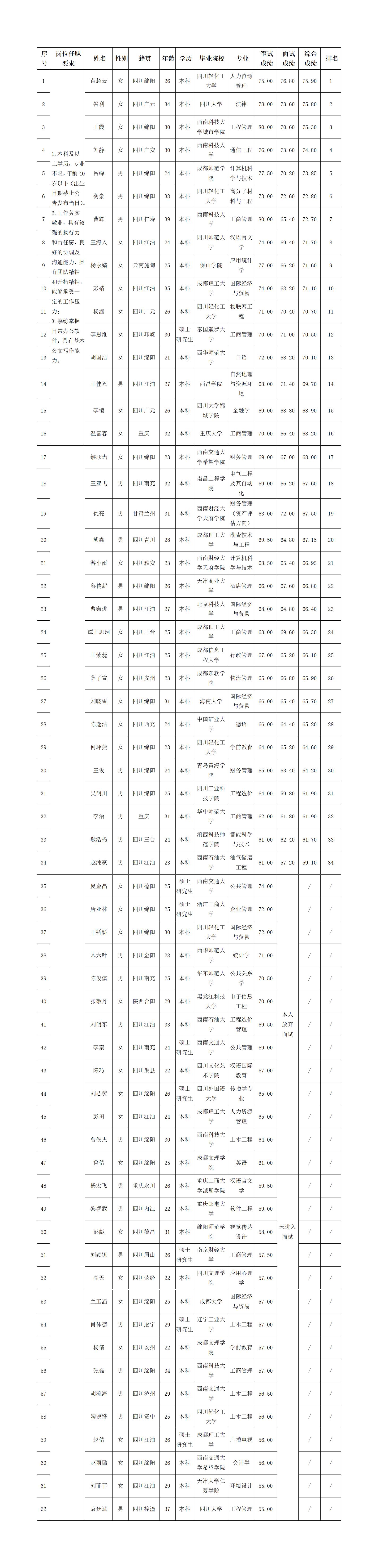 根据四川绵江能源有限公司发布的招聘公告及招聘相关规定,经笔试、面试等程序,现将笔试、面试成绩予以公示。