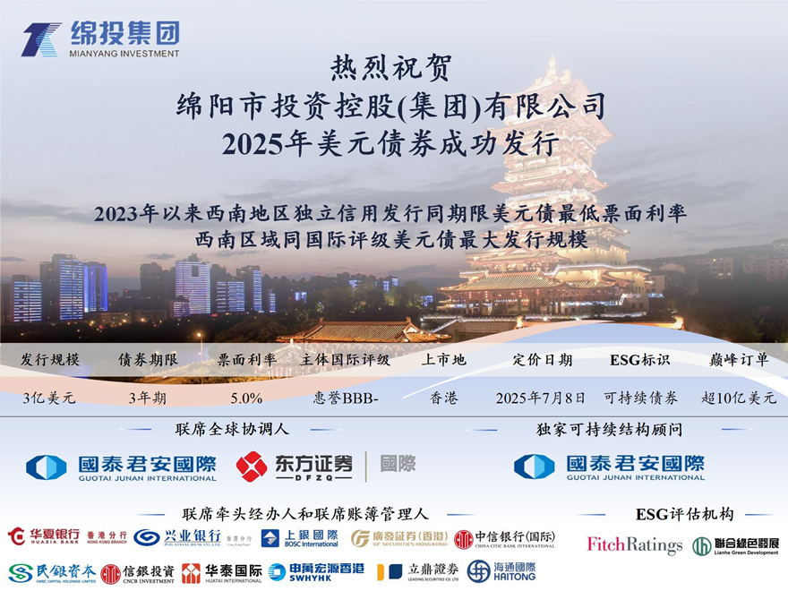 7月8日,k1体育注册就送38元集团成功定价发行3亿美元、3年期可持续美元债券,认购倍数3.43倍(峰值订单超10亿美元),最终票面利率强势锁定5.00%,较初始价格指引大幅收窄70个基点,创2023年以来西南地区独立信用发行同期限境外美元债最低票面利率、西南区域同国际评级美元债最大发行规模,以及创2025年以来中资投资级地方国企美元债最大收窄幅度。