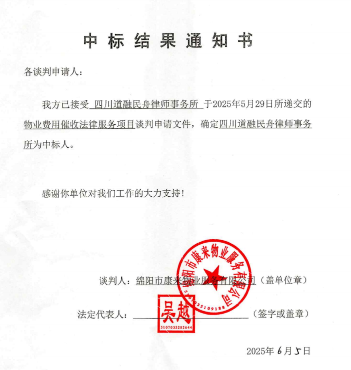 物业费用催收法律服务项目中标结果通知书