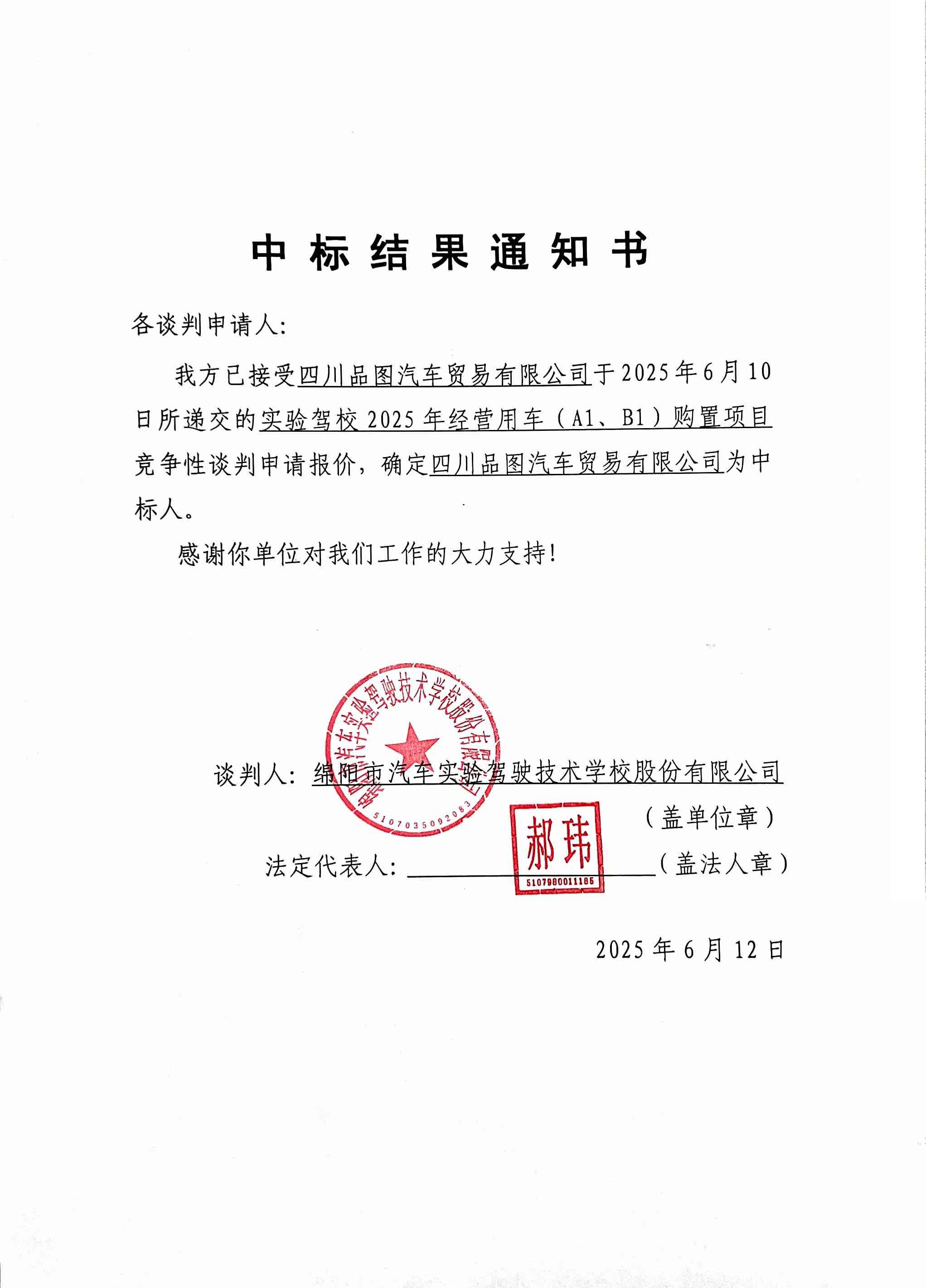 实验驾校2025年经营用车(A1、B1)购置项目中标结果通知