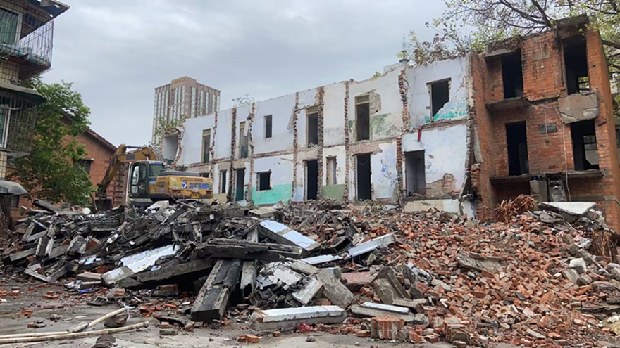 危房紧邻周边住宅,施工空间狭小,拆除难度极大。为确保拆除工作安全有序进行,富达公司多次组织建筑、安全专家现场勘查,研究制定了“机械拆除为主,人工配合为辅”的精细化拆除方案。拆除现场,工作人员设置警戒线封锁拆除区域,专人疏导围观群众,维护现场秩序。伴随着挖掘机的轰鸣声,危房楼体结构在专业人员的精准操控下逐步瓦解,同步实施洒水降尘措施,整个拆除过程安全、有序、环保。
